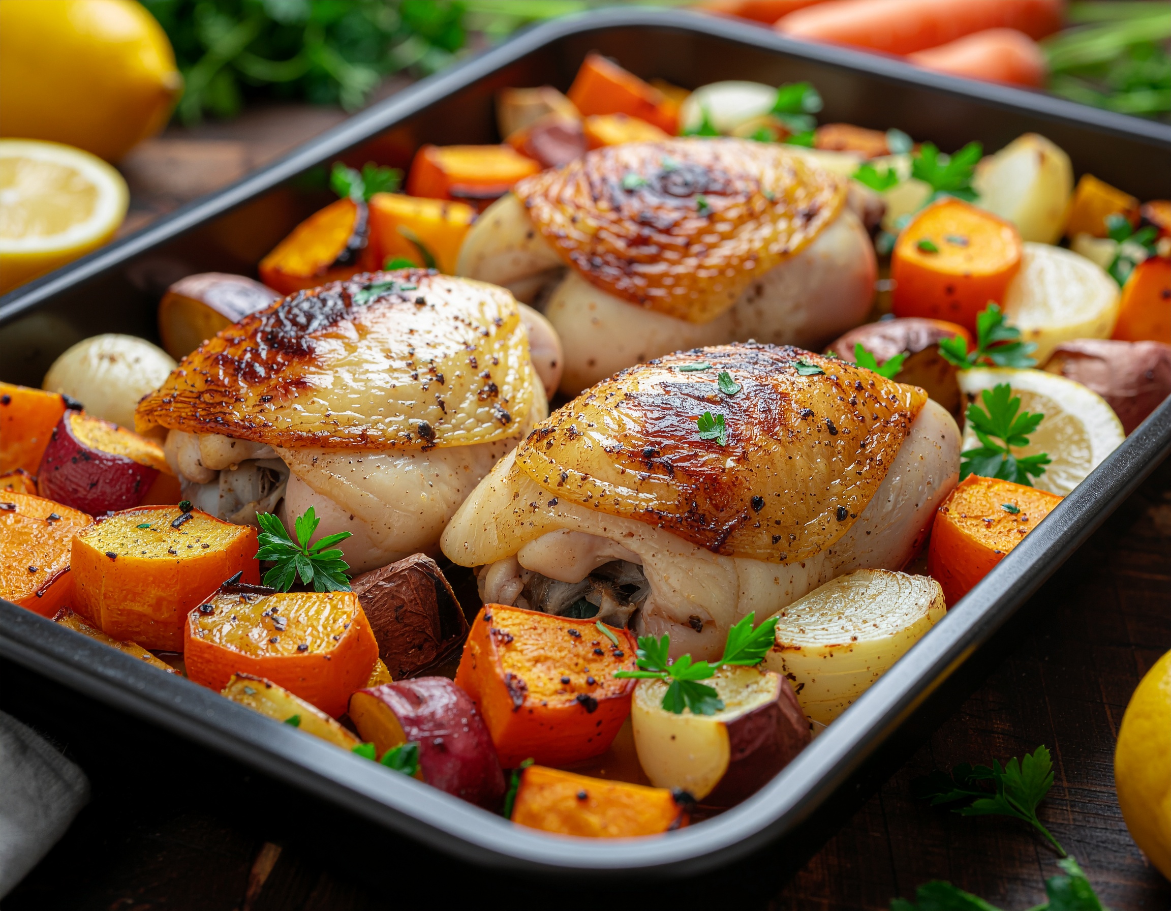 Juicy, skin-on chicken thighs roasted with colorful root vegetables in a one-pan meal, seasoned with fresh herbs and bright lemon. This dish is a perfect blend of savory and citrus flavors, making it a hearty and refreshing meal for any occasion.
