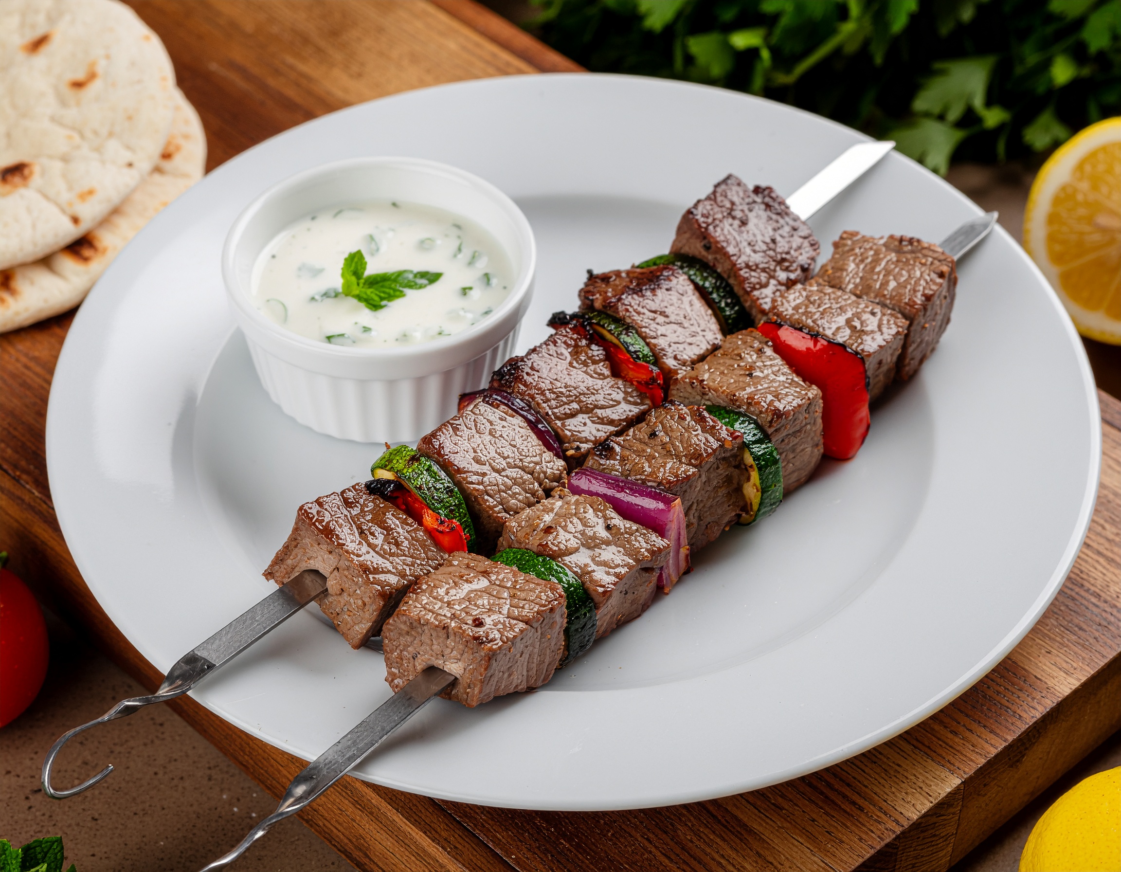 Lean beef cubes marinated in Mediterranean herbs and grilled on skewers with fresh vegetables, served with a cooling yogurt sauce and whole wheat pita. This dish brings the vibrant flavors of the Mediterranean to your table, offering a healthy and satisfying meal perfect for any occasion.