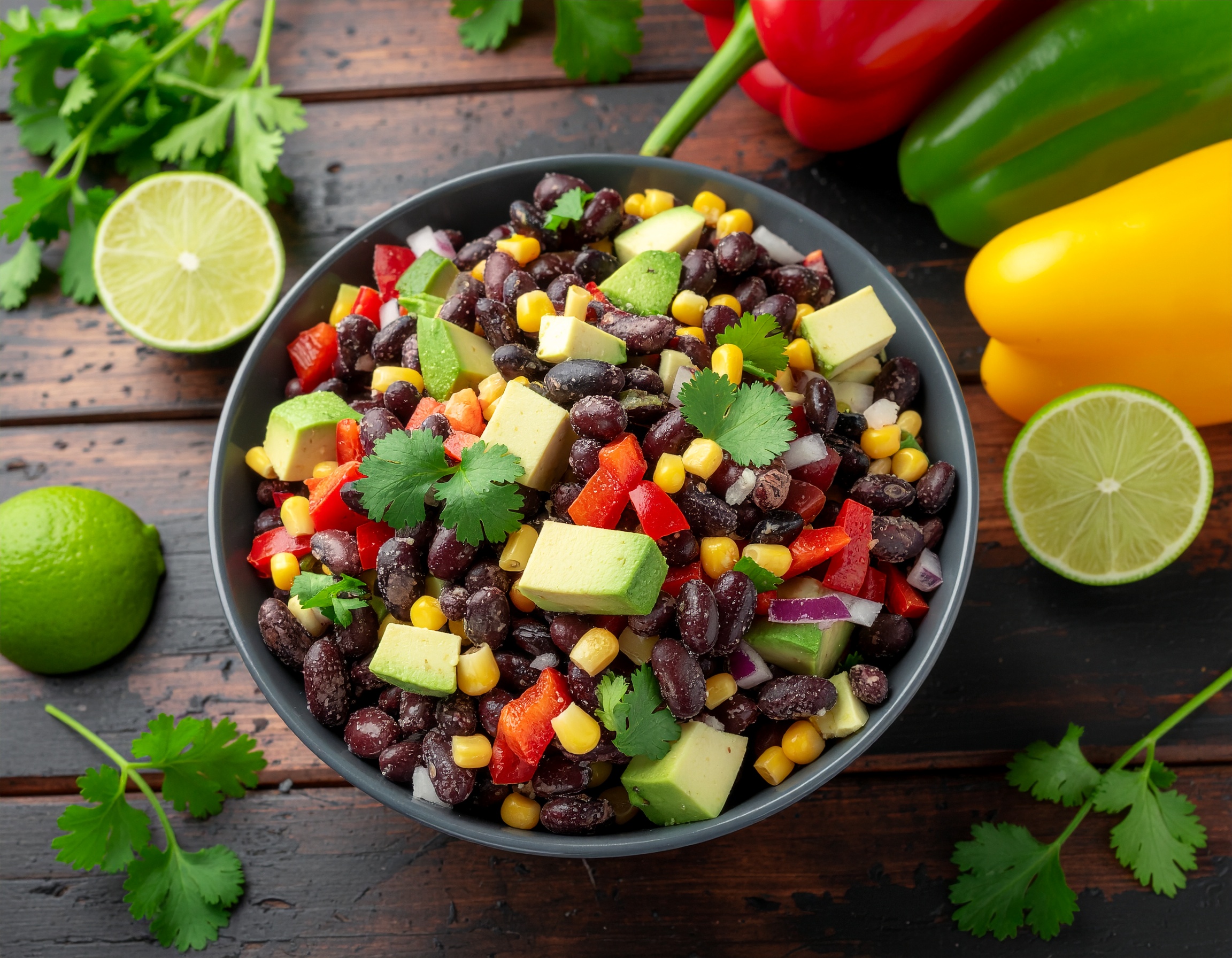 A protein-rich Mexican-inspired salad packed with black beans, corn, bell peppers, and fresh herbs, all tossed in a zesty lime vinaigrette. Perfect for a refreshing side dish or a light meal on its own.