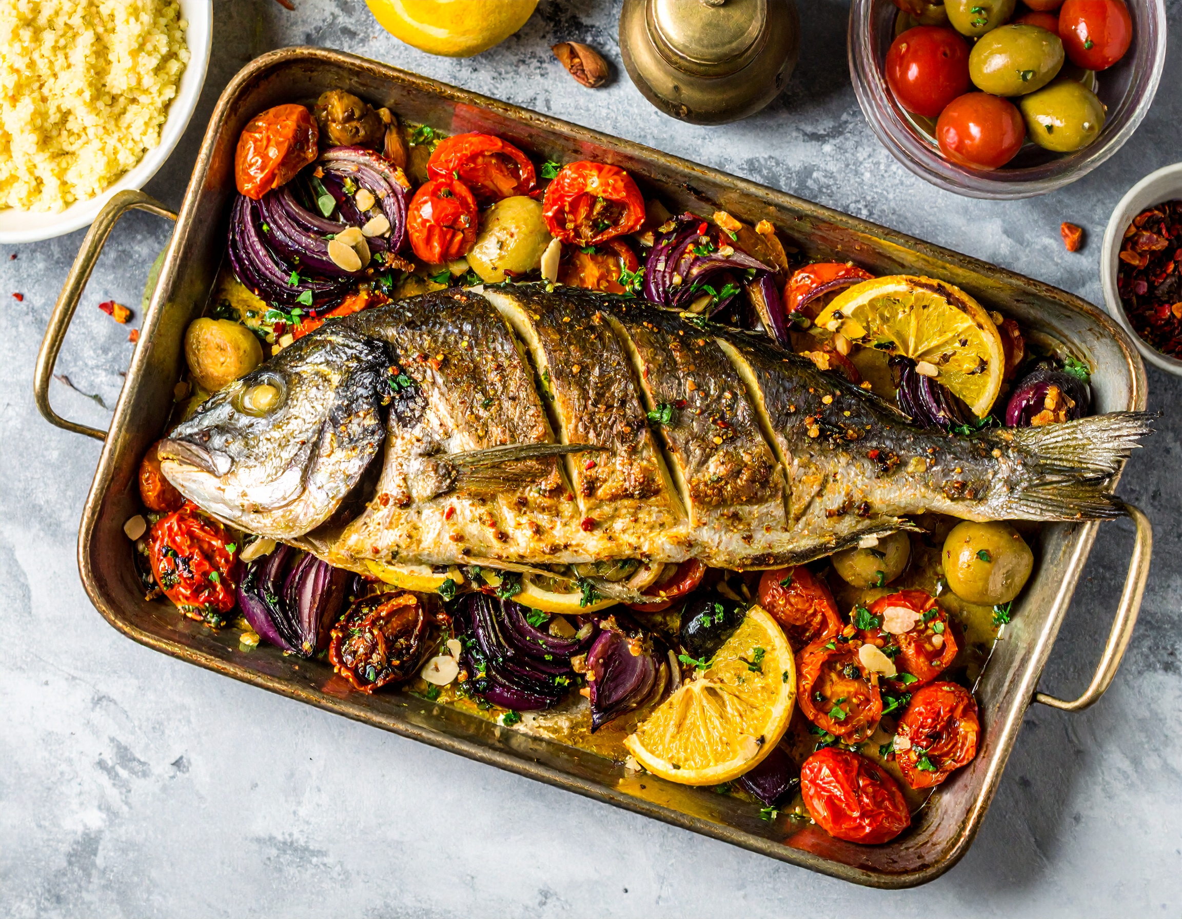Step 7Serve the whole fish with roasted vegetables over couscous, garnished with fresh herbs.