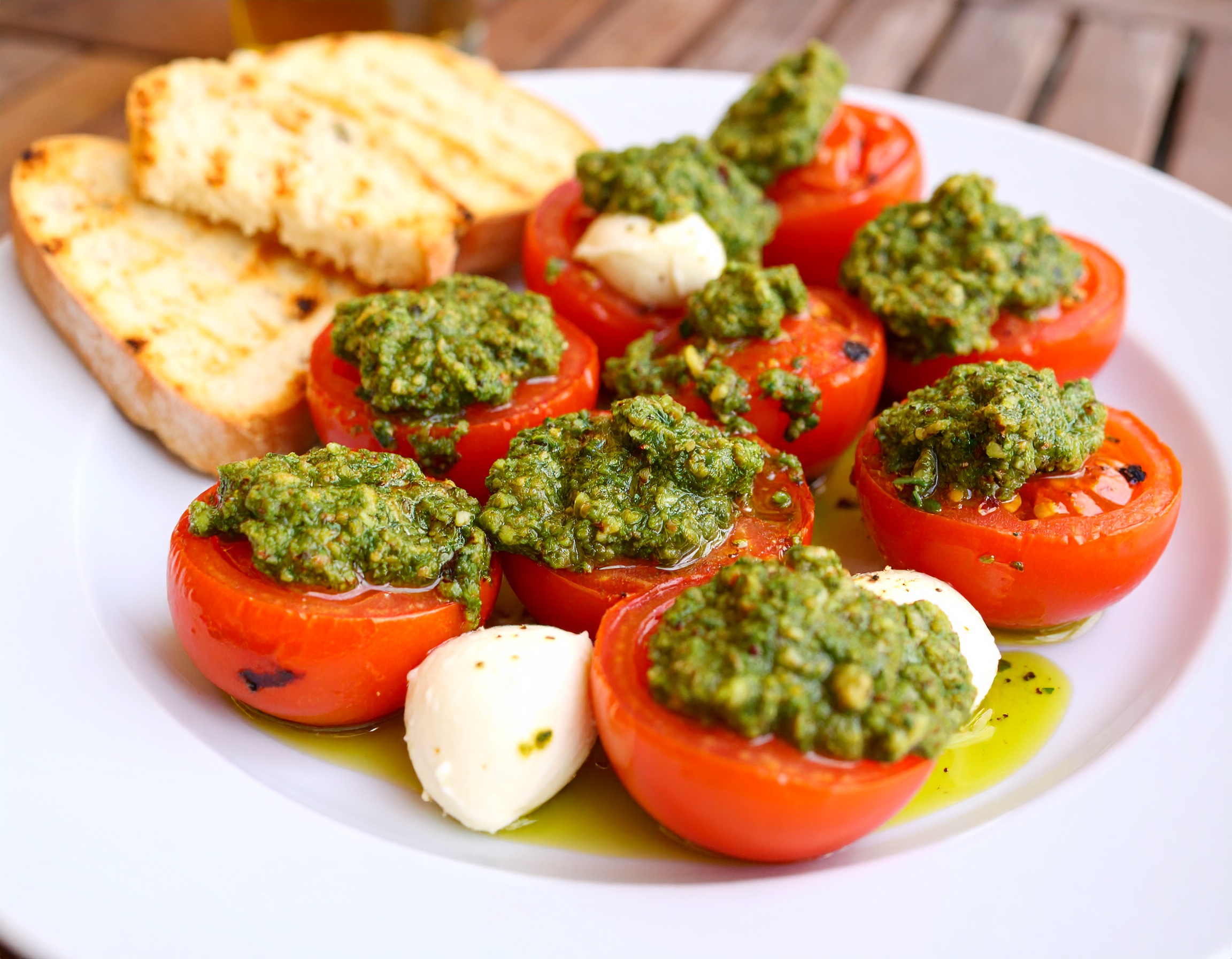 A delightful summer dish combining creamy mozzarella pearls, roasted tomatoes, and aromatic pesto, all drizzled with a sweet balsamic glaze. Served with crispy crostinis, this dish is perfect for those warm evenings when you crave something light yet satisfying.